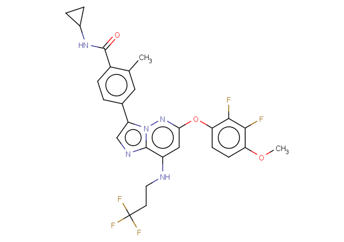 | SMILES | Cc1c(ccc(c1)c1cnc2n1nc(cc2NCCC(F)(F)F)Oc1c(c(c(cc1)OC)F)F)C(=O)NC1CC1 |