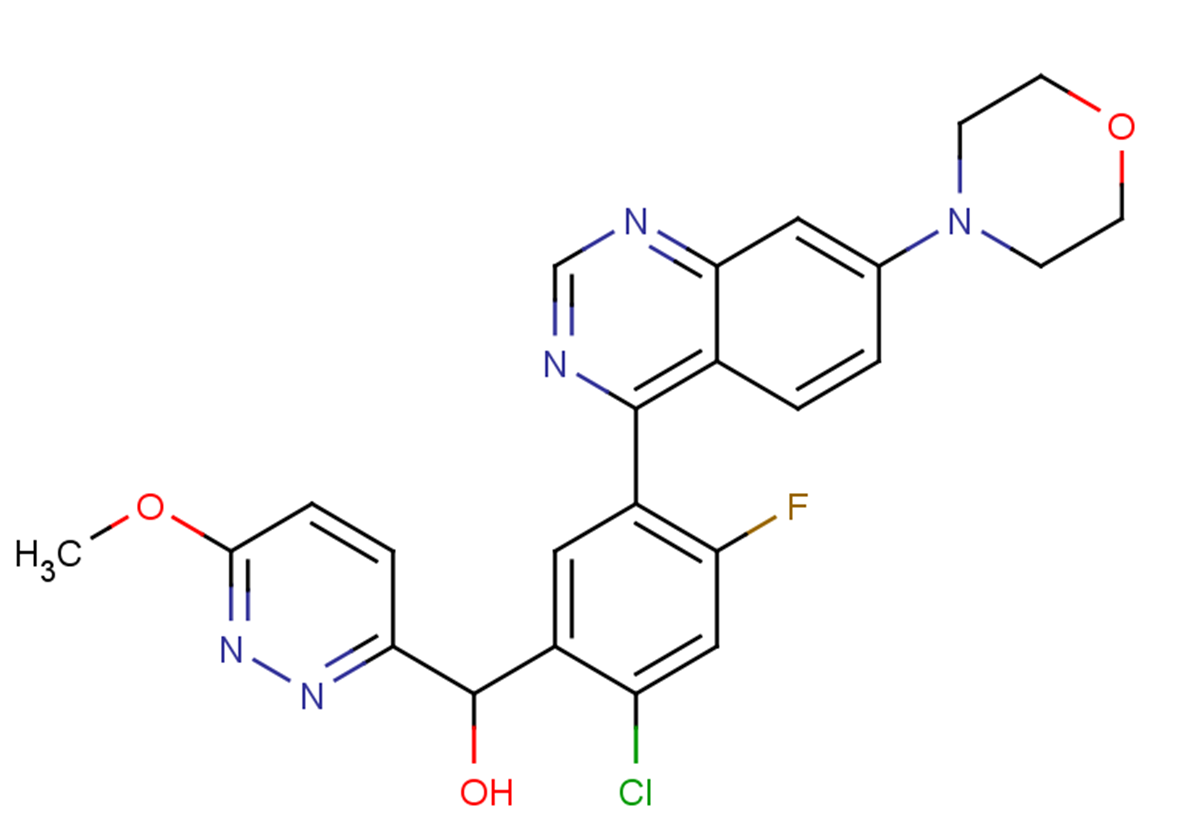 | SMILES | FC=1C=C(Cl)C(=CC1C=2N=CN=C3C=C(C=CC32)N4CCOCC4)C(O)C5=NN=C(OC)C=C5 |
