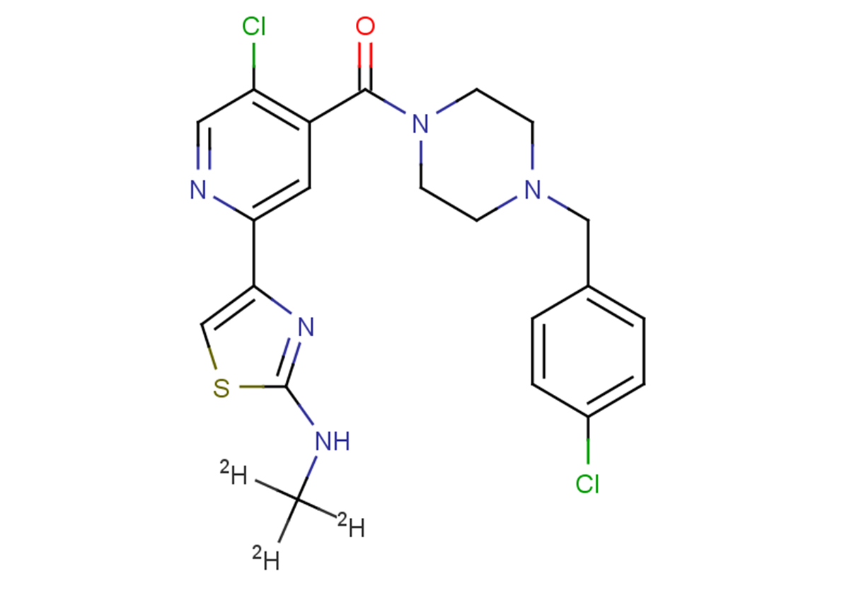 | SMILES | C(=O)(C=1C=C(N=CC1Cl)C=2N=C(NC([2H])([2H])[2H])SC2)N3CCN(CC4=CC=C(Cl)C=C4)CC3 |