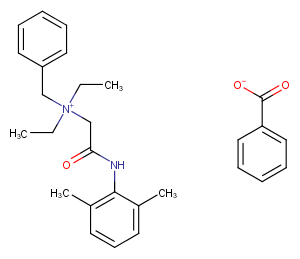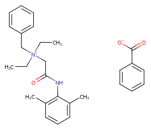 Denatonium, a quaternary ammonium cation, is a compound of a salt with an inert anion like saccharide or benzoate. Its structure is involved in the local anesthetic lidocaine which difference only is the addition of a benzyl group to the amino nitrogen.