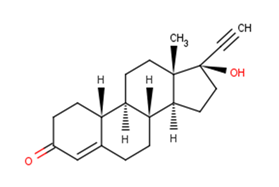Norethindrone is a synthetic progestational hormone with actions similar to those of PROGESTERONE but functioning as a more potent inhibitor of ovulation. It has weak estrogenic and androgenic properties. The hormone has been used in treating amenorrhea, functional uterine bleeding, endometriosis, and for contraception.